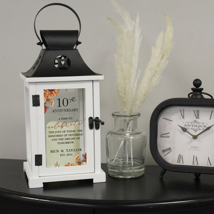 Curated with quality wood and a stainless steel copper or black finish top, this personalized wedding anniversary lantern is printed with a floral design and text that reads "A time to celebrate the joys of today, the memories of yesterday and the dreams of tomorrow." It is then personalized with the couple's names and wedding date and amount of years together.
