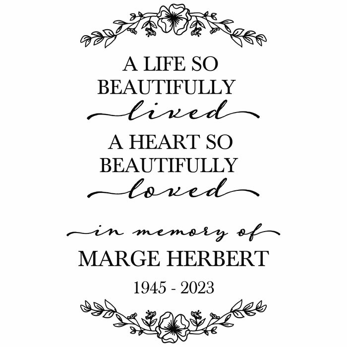 Engraved with a graceful floral design, it features the heartfelt quote: "A life so beautifully lived, a heart so beautifully loved." Personalized with your loved one’s name and years of life, it serves as a lasting reminder of a life well lived.