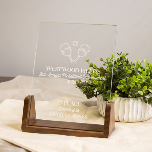 Honor the champion of your club’s pickleball tournament with this sleek, personalized trophy! Made from high-quality crystal with a wooden base, th...