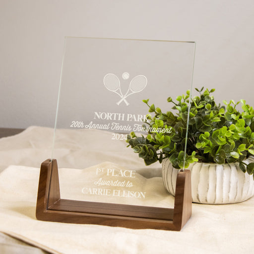 Celebrate the champion of your tennis event with this elegant personalized award! Made from high-quality crystal with a wooden base, this tennis ch...