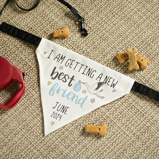 Featuring a sweet stork design, this dog bandana reads "I Am Getting a New Best Friend" and is personalized with your baby's due date. Choose betwe...