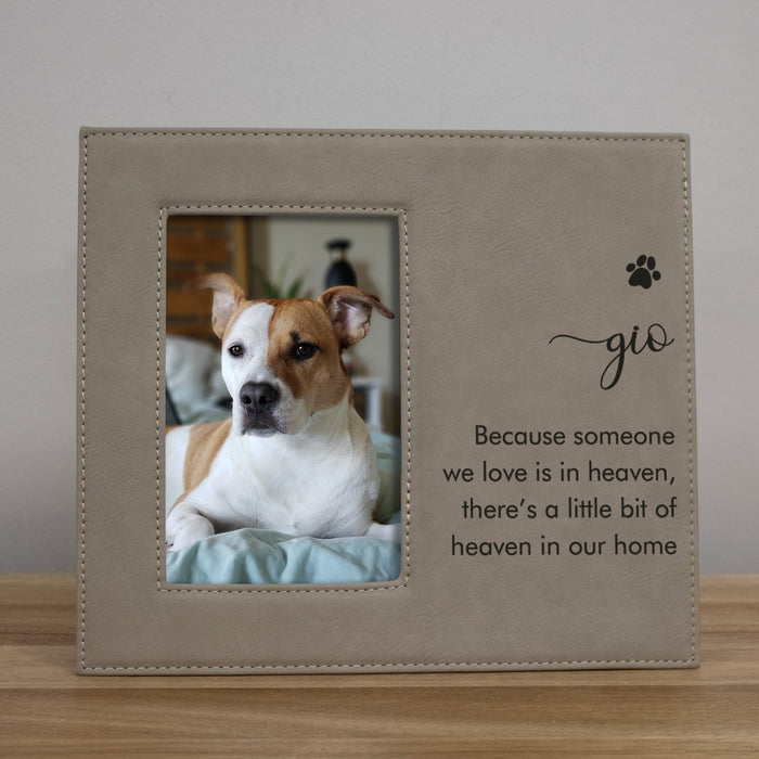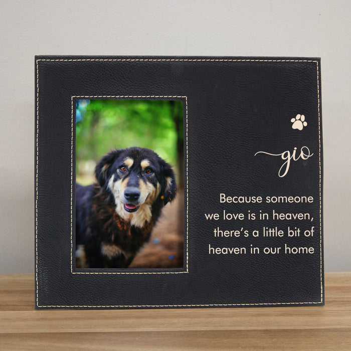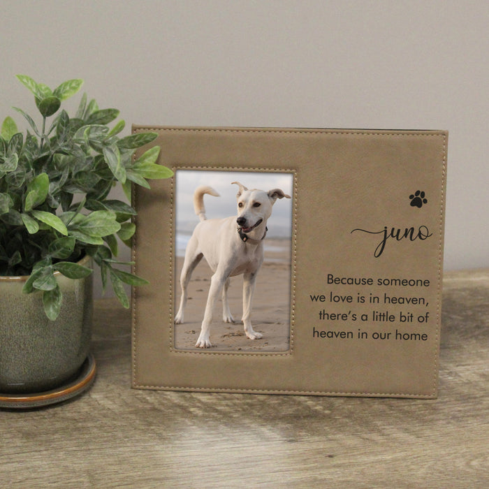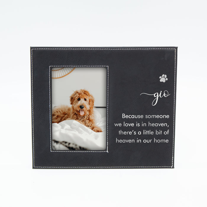 Featuring the touching quote: “Because someone we love is in heaven, there's a little bit of heaven in our home," this personalized dog memorial frame includes your dog’s name and fits a 4x6 vertical photo.