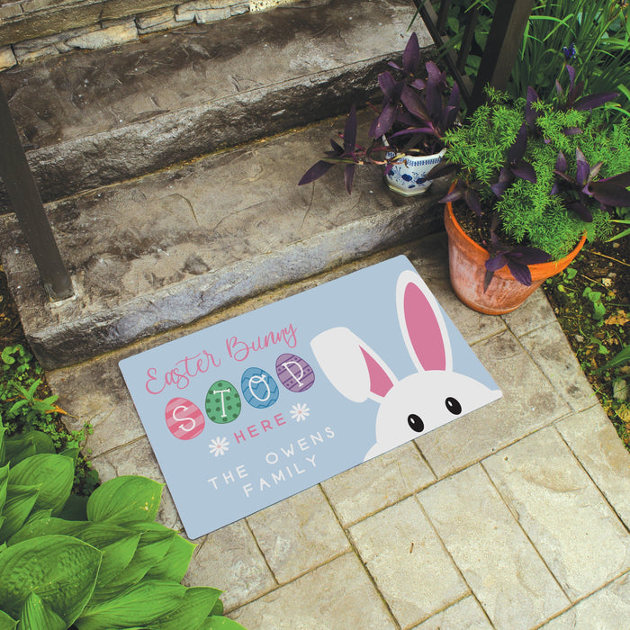 Designed for indoor or outdoor use, this durable mat features the cheerful phrase "Easter Bunny Stop Here" along with a white bunny and colorful Easter eggs.