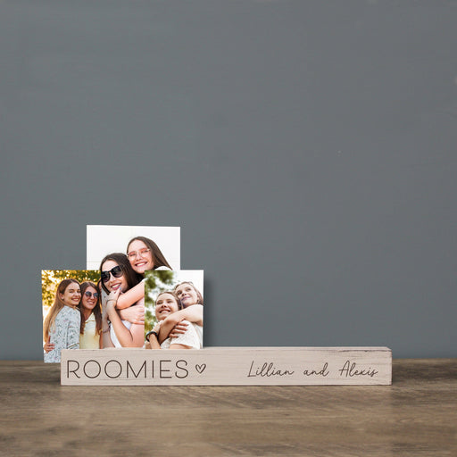 Perfect for display in your dorm or apartment, this roommates photo bar reads "Roomies" and is personalized with the roommate's names.