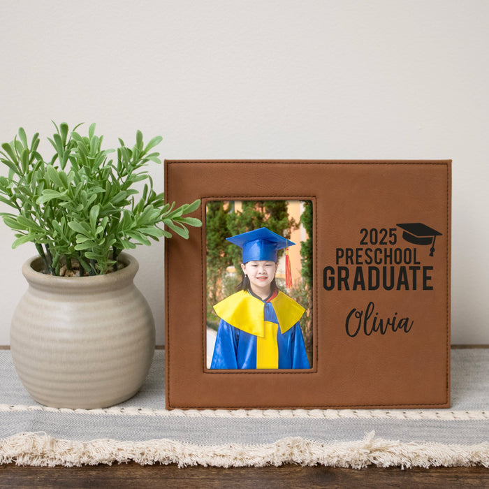 Made from vegan leather, the frame reads “Preschool Graduate” and is personalized with the graduate’s name and year, making it a delightful keepsake.