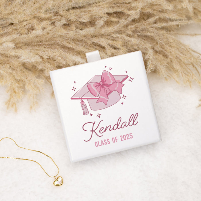 The box features a stylish pink bow graduation cap design and is personalized with her name and class year. Inside, she’ll discover a beautiful gold and opal heart necklace—a symbol of love, pride, and accomplishment she’ll cherish for years to come.