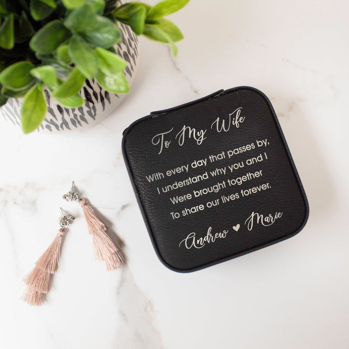 This jewelry box is laser engraved with the heartfelt message, "With every day that passes by, I understand why you and I were brought together to share our lives forever," and personalized with the couple’s names.