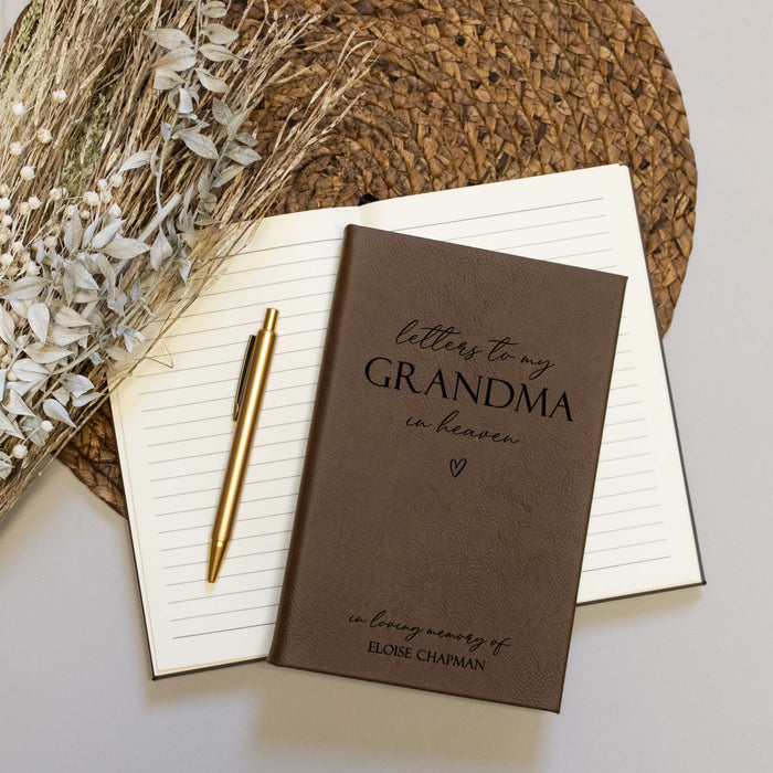Find comfort and healing with this personalized grief journal, titled 'Letters to My Grandma in Heaven.' Featuring your late grandmother’s name, this journal provides a special space to write your thoughts, memories, and messages, helping you keep her close in heart and spirit.