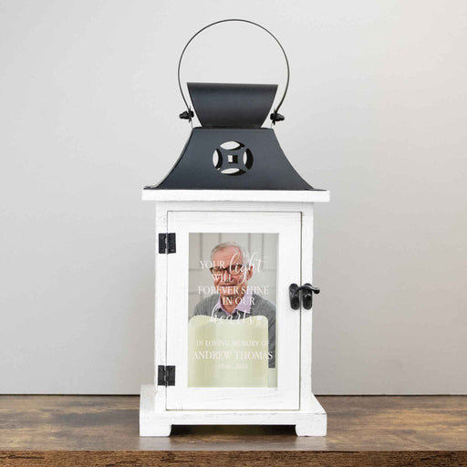 A heartfelt way to honor the memory of a loved one. This sympathy photo lantern reads, “Your light will shine forever in our hearts,”and is persona...