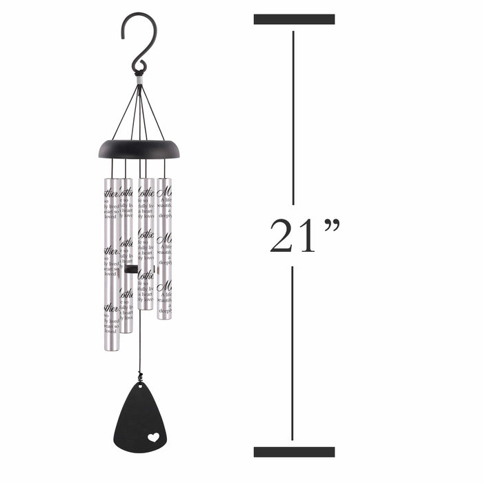 Measuring 21” in length, this heartfelt sympathy wind chime features aluminum tubes inscribed with the words: “Mother... a life so beautifully lived... a heart so deeply loved.”
