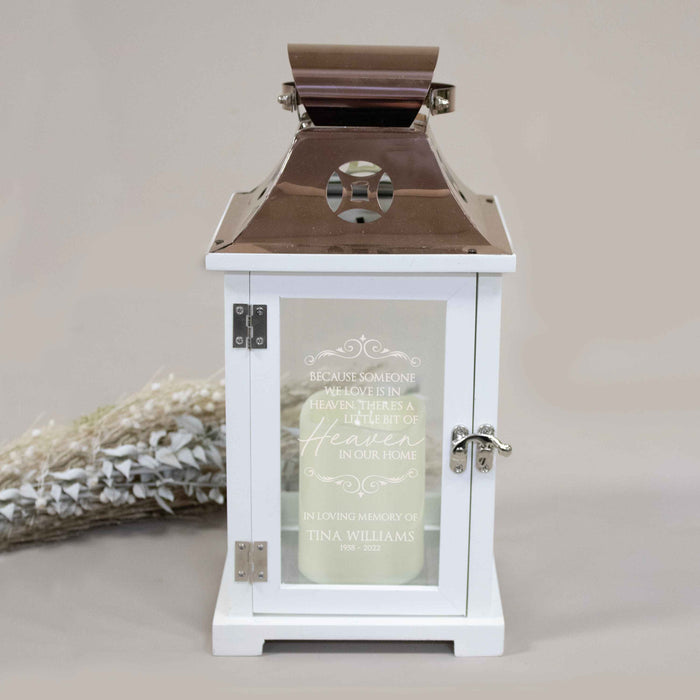 Made with quality wood and featuring a stainless steel top, this remembrance lantern is engraved with the touching quote, "Because someone we love is in Heaven, there's a little bit of Heaven in our home."