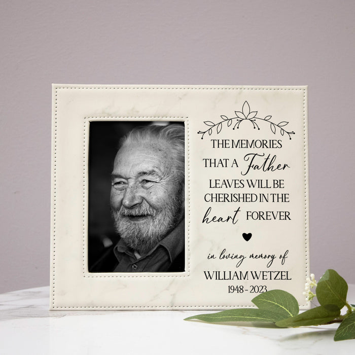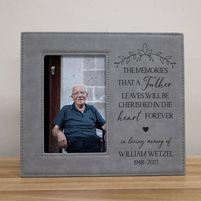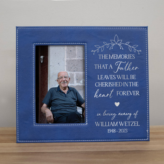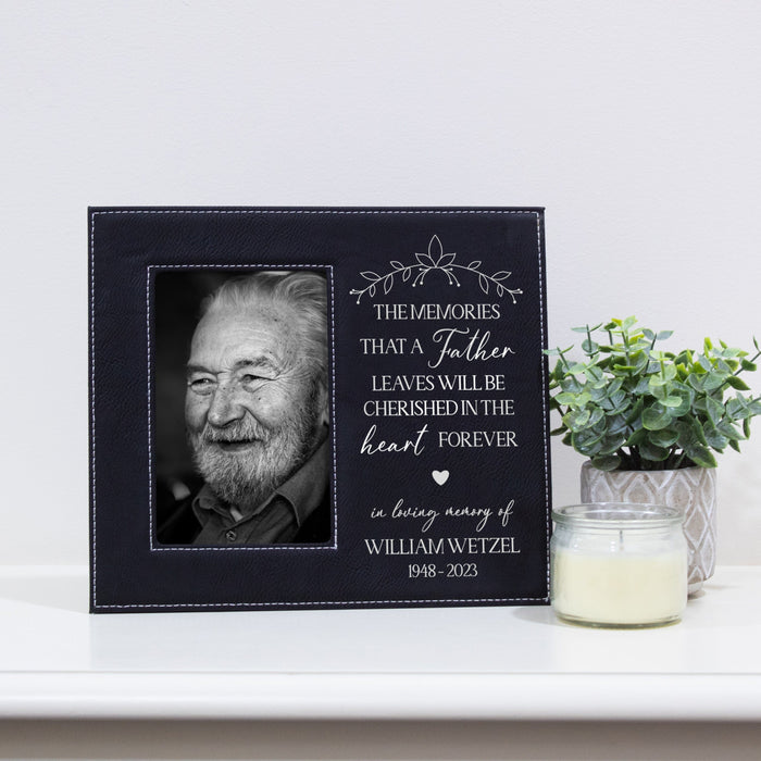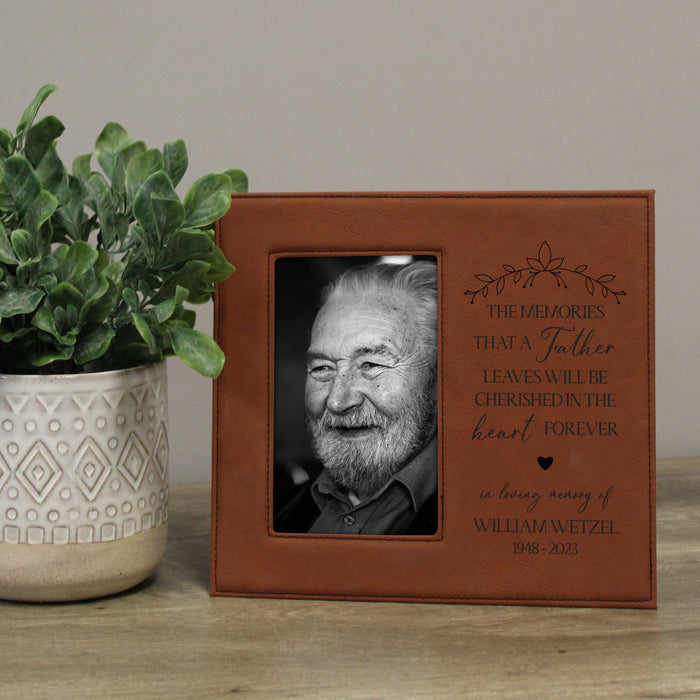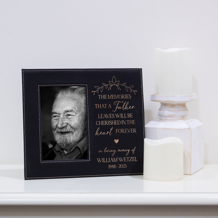 This vegan leather picture frame is engraved with the touching quote: "The memories that a father leaves will be cherished in the heart forever."