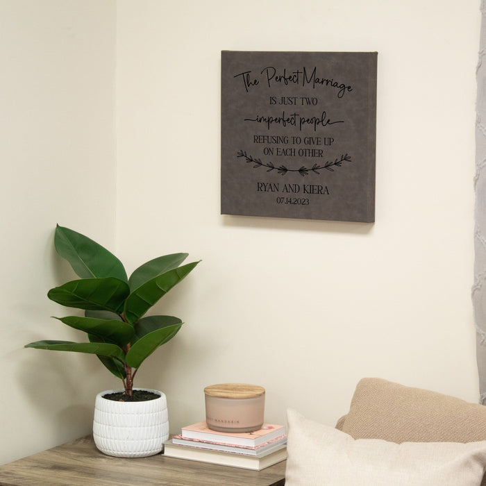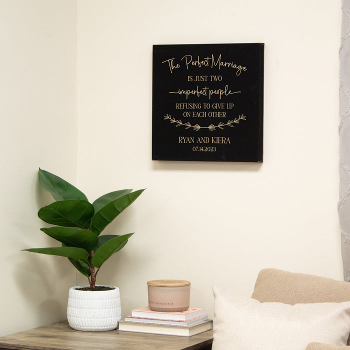 Featuring the quote "The perfect marriage is just two imperfect people refusing to give up on each other" this love wall sign is personalized with the couple's names and wedding date.
