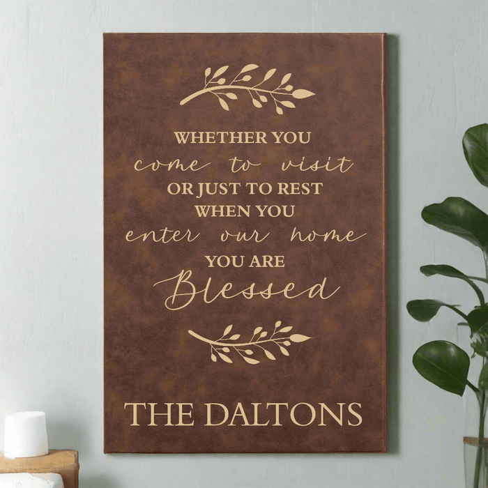 Welcome guests to your home with this sweet and inviting personalized wall sign! Engraved with the quote "Whether you come to visit or just to rest when you enter our home you are Blessed," It is personalized with your family's name.