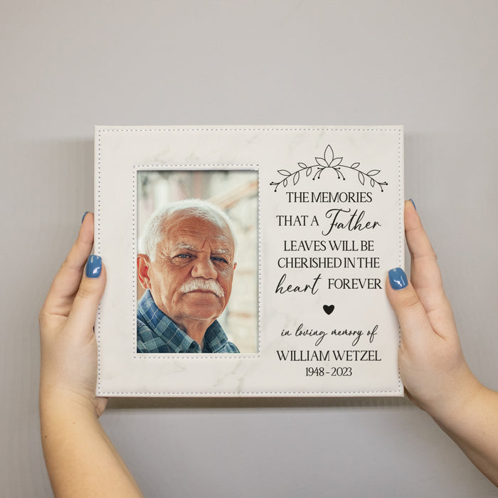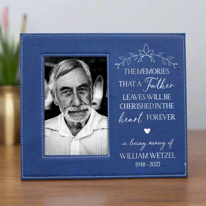 This vegan leather picture frame is engraved with the touching quote: "The memories that a father leaves will be cherished in the heart forever."