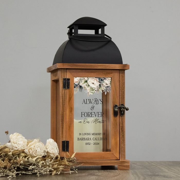 Crafted from high-quality metal and glass, it features the comforting message "Always & Forever in our hearts" along with a delicate floral design at the top. Below, it is personalized with the loved one’s name and years of life beneath the words "In Loving Memory."