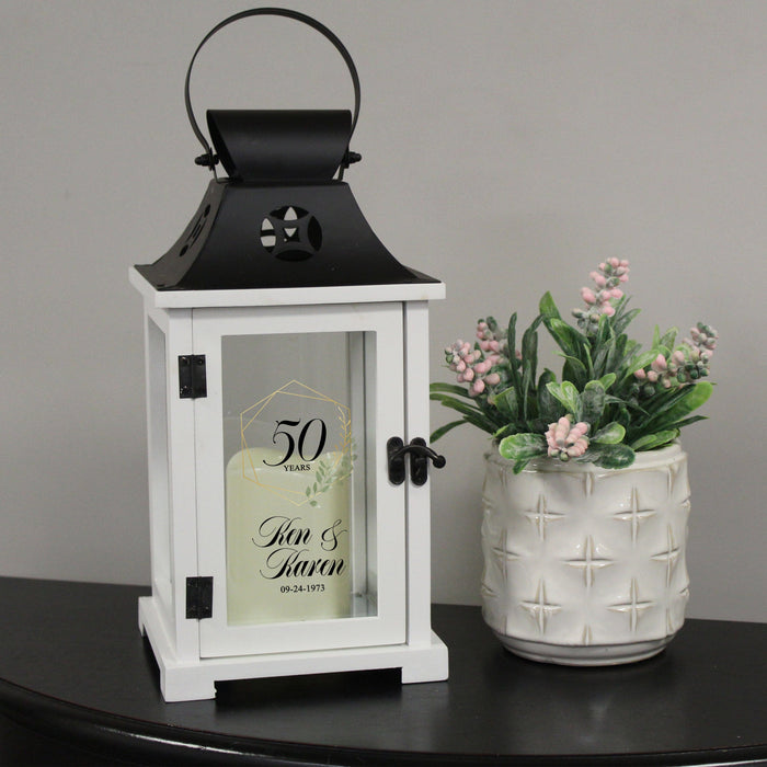 An attached handle on the top of this personalized anniversary lantern allows you to hang it or use it freestanding.