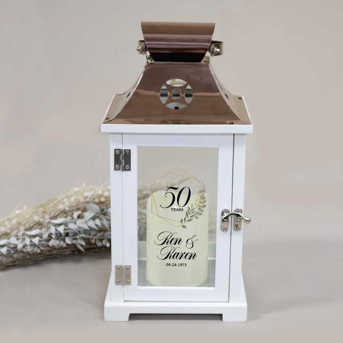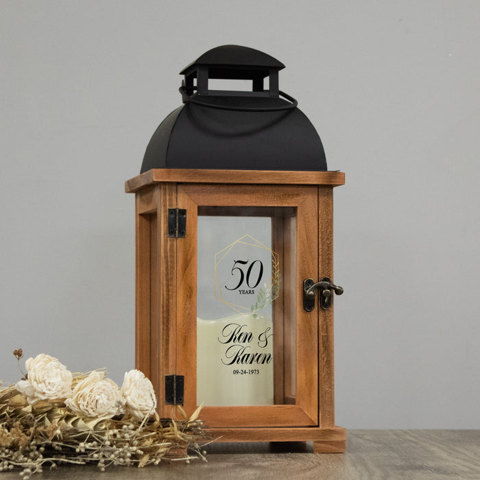 Crafted with quality wood and a stainless steel copper or black finish top, this personalized wedding anniversary lantern is printed wreath that includes the number of years married. It is then personalized with the couple's names and wedding date.