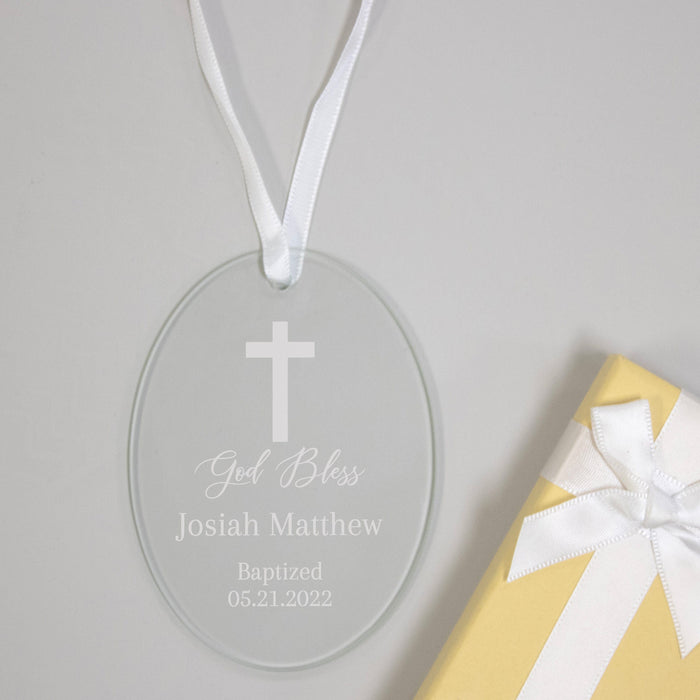 Made of glass, this oval-shaped religious baptism ornament features a cross and is personalized with the child's name and baptism date.
