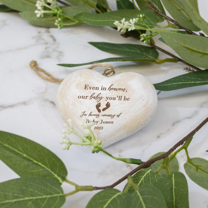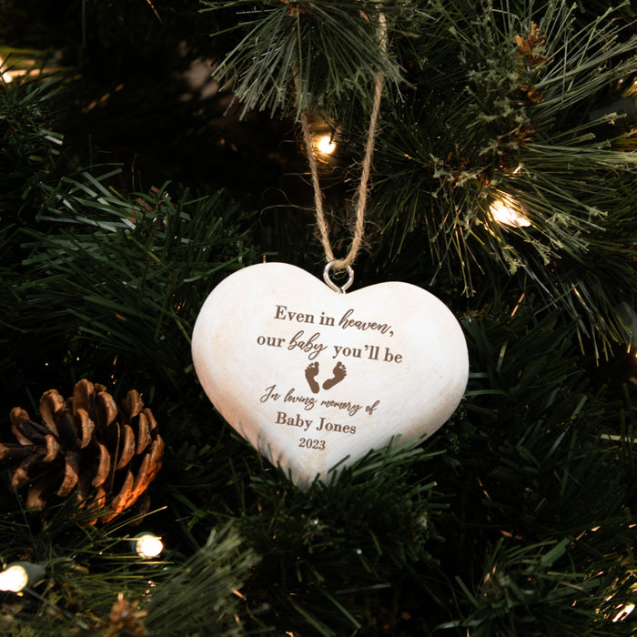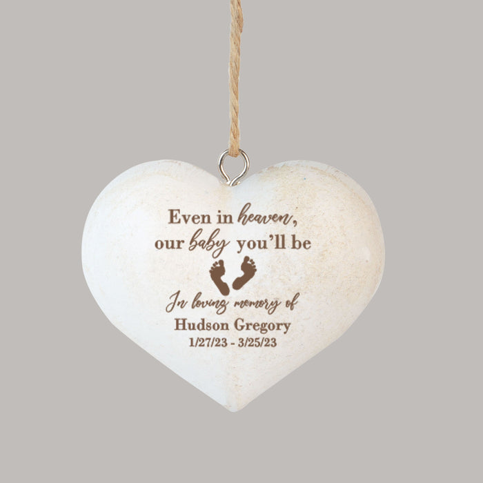 This wooden heart ornament is engraved with the touching quote, "Even in Heaven, our baby you'll be," and personalized with your child's name and years of life.