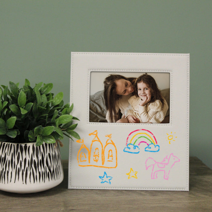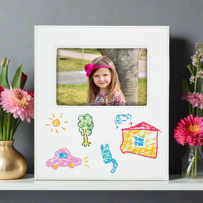 This white vegan leather picture frame is UV printed with the child's actual drawing! Simply send us an image of the kid's hand drawn picture or note and we will print it onto the picture frame making a one-of-a-kind gift.