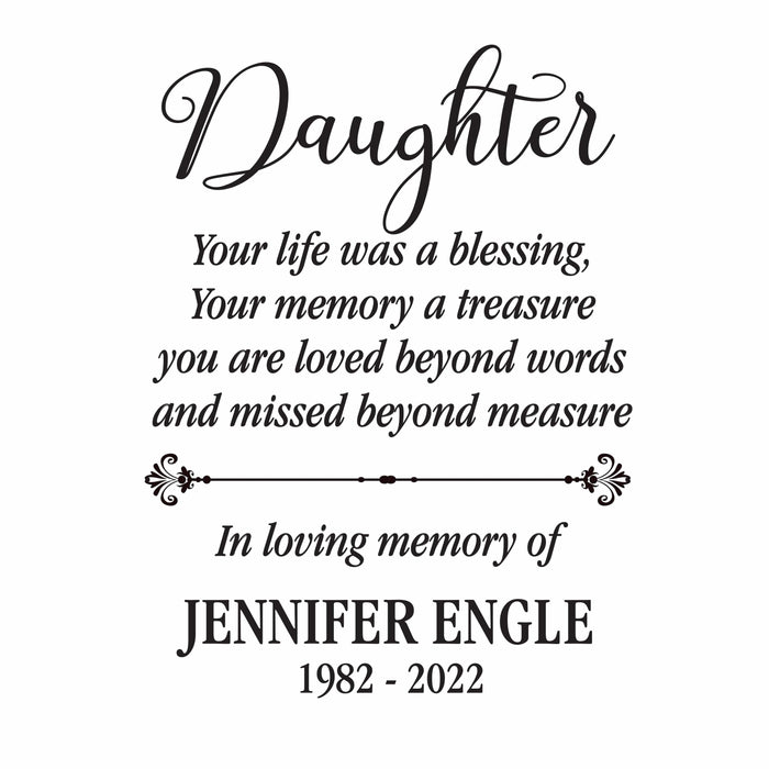 This memorial bird feeder is engraved with a the quote "Daughter, your life was a blessing, your memory a treasure, you are loved beyond words and missed beyond measure," and it is personalized with her name and years of life.