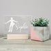 Crafted from acrylic with a wood base, it features a laser-engraved figure skater silhouette and is personalized with the child’s name. The white LED light beautifully illuminates the design, creating a unique room decor piece.