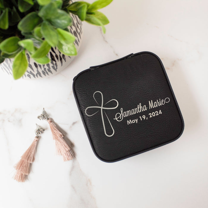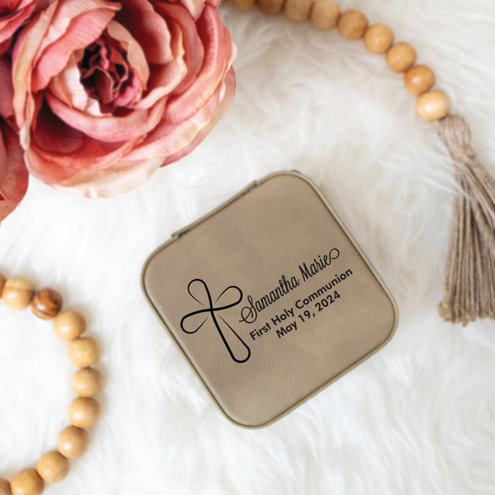 This travel jewelry box showcases a delicate cross design and is personalized with the child’s name and First Communion date.