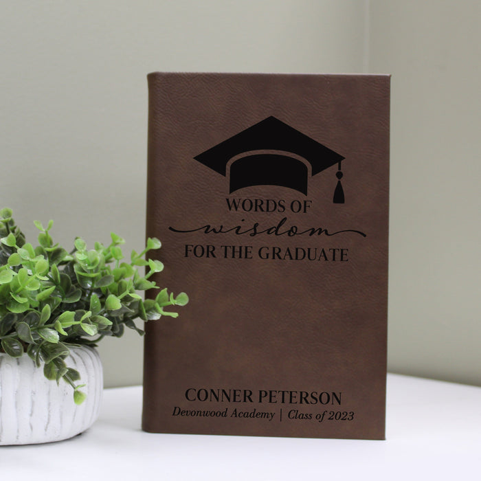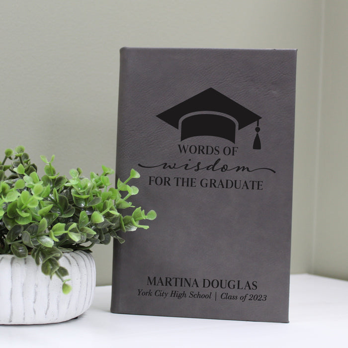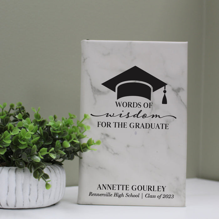Share your words of wisdom, best advice and well wishes for the new grad in this graduation guest book.  Featuring the text "Words of Wisdom for the New Graduate" beneath a graduation cap, it is personalized with the graduate's name and school.