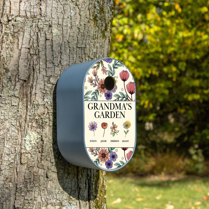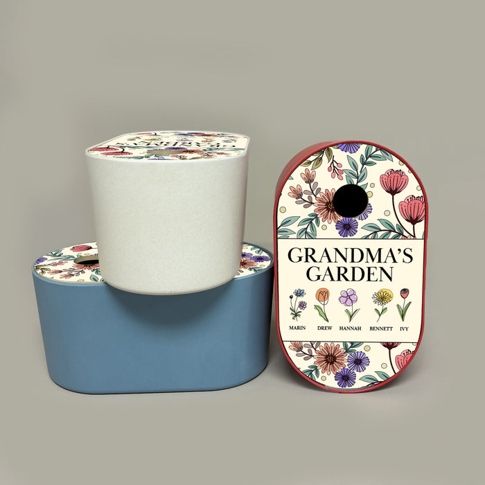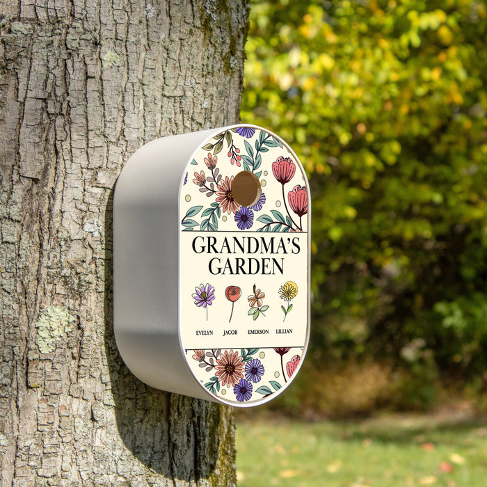 This charming Grandma's Garden birdhouse features a vibrant floral design and can be personalized with each grandchild’s name beneath a flower—creating a heartfelt tribute in her outdoor space.