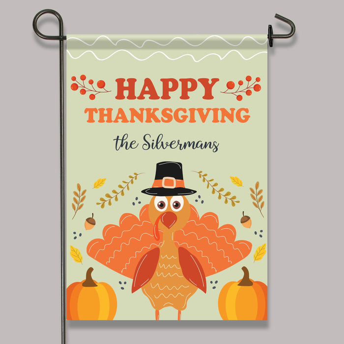 Welcome guests in seasonal style with this personalized Thanksgiving garden flag!
