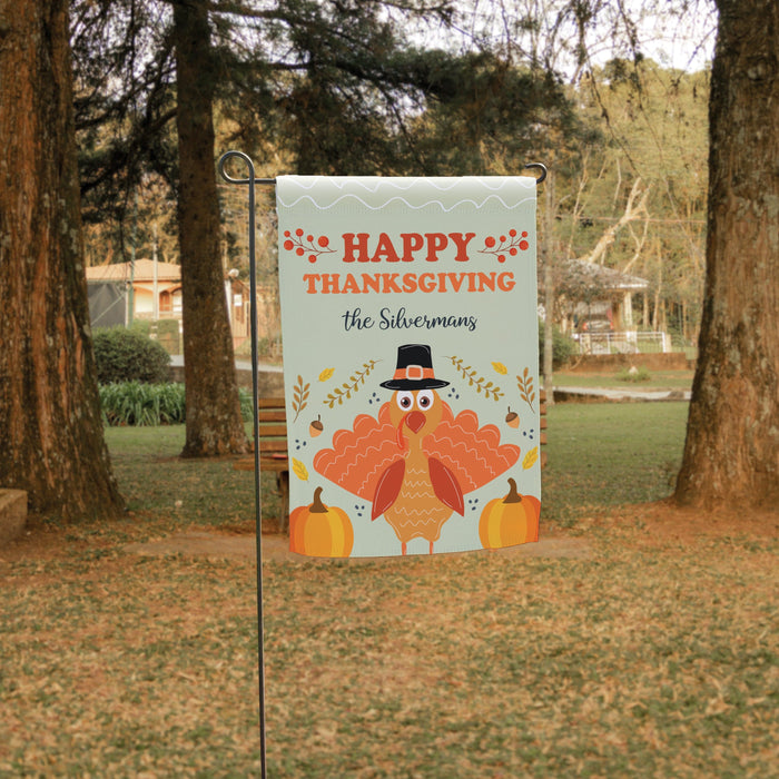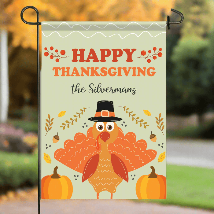 Decorated with autumn leaves, pumpkins, and a cheerful turkey, this festive flag reads "Happy Thanksgiving" and is customized with your family’s last name.