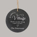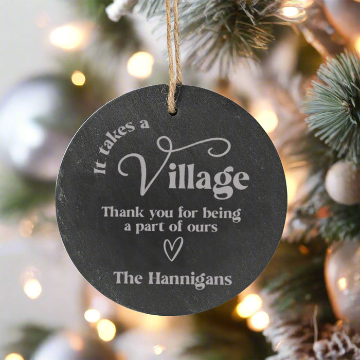 Perfect for expressing appreciation, this custom ornament features the heartfelt sentiment, "It takes a village. Thank you for being a part of ours." It is then personalized with your name below a hand-drawn heart.