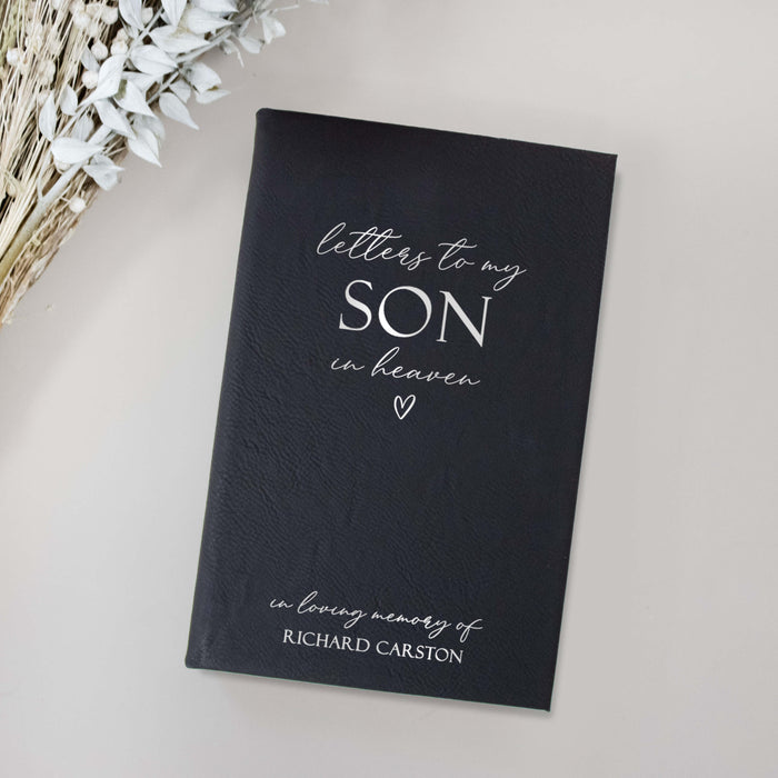 Remember your beloved son with this personalized grief journal, titled 'Letters to My Son in Heaven.' Customized with his name, this journal provides a comforting space to write your thoughts, memories, and messages—keeping his spirit close to your heart.