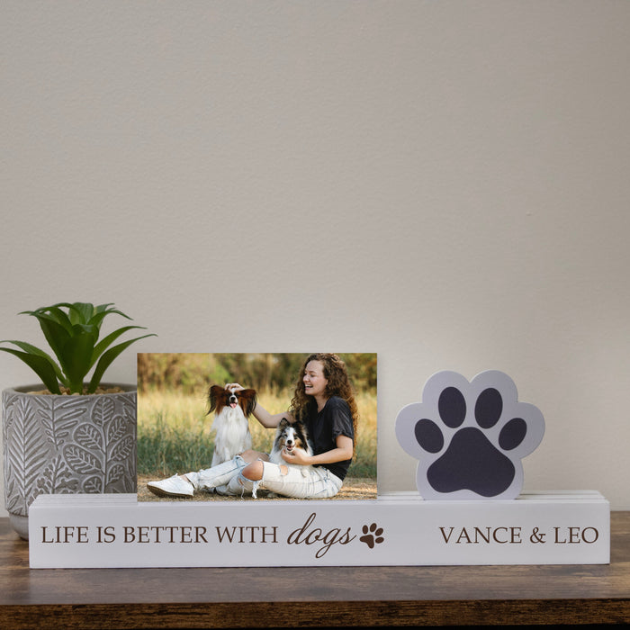 The perfect gift for any dog lover, this photo bar is laser engraved with 'Life is Better with Dogs' and personalized with your dog’s name(s). It includes a paw print decal and an acrylic cover—ideal for showcasing your favorite photo of your furry friend.