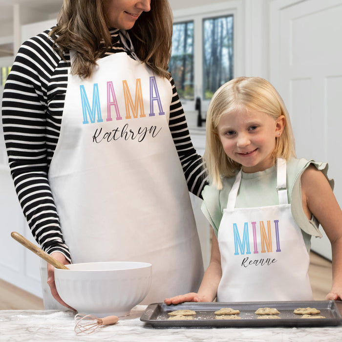 Each apron features a vibrant "Mama" or "Mini" design, personalized with their names to make every baking moment feel extra special.