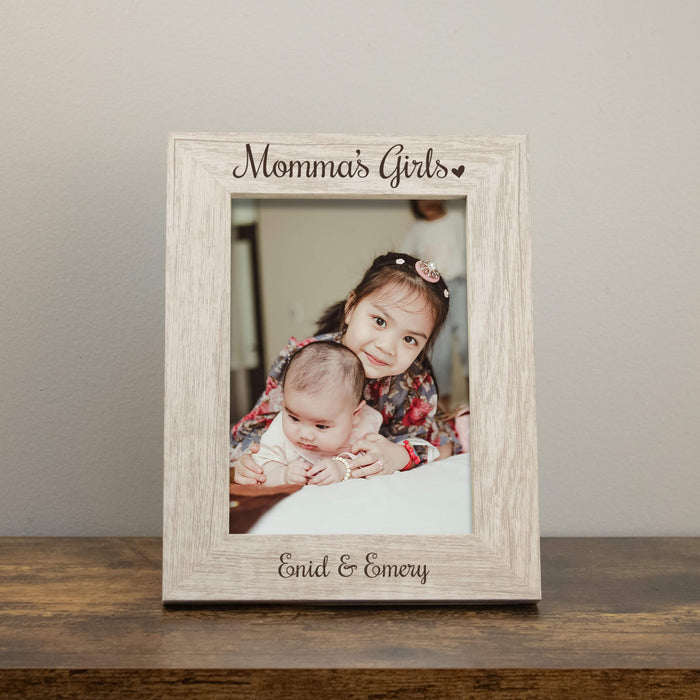 Perfect for moms with daughters, it features “Momma’s Girls” at the top and is customized with her daughters’ names for a truly special keepsake.