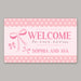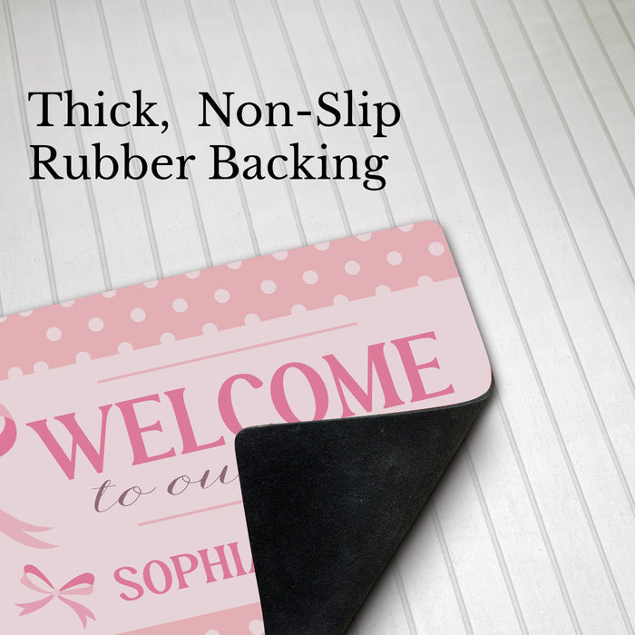 Featuring a soft pink coquette bow pattern, this charming dorm room mat reads "Welcome to our room" and is personalized with both roommates' names.