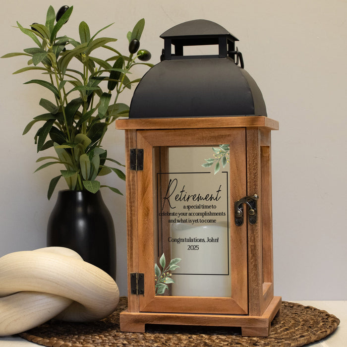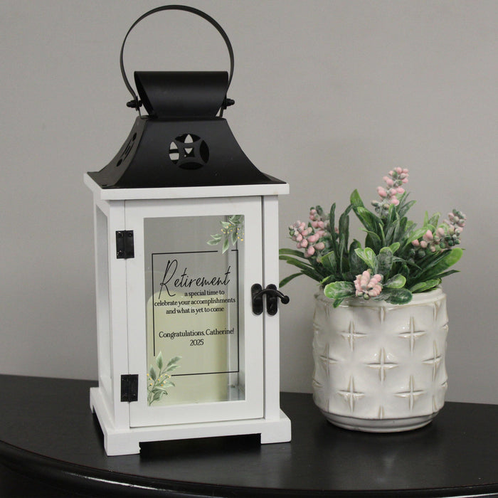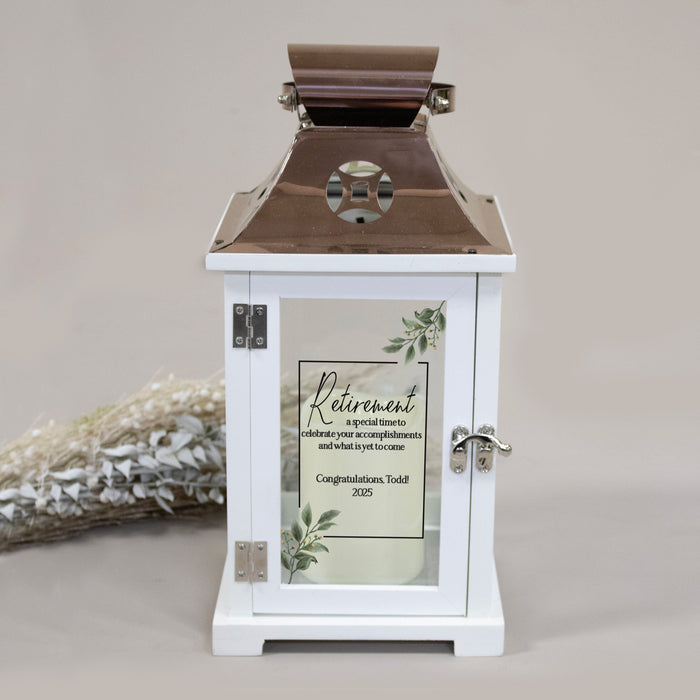 Featuring the heartfelt message, "Retirement — a special time to celebrate your accomplishments and what is yet to come," this lantern is a meaningful tribute to their journey.