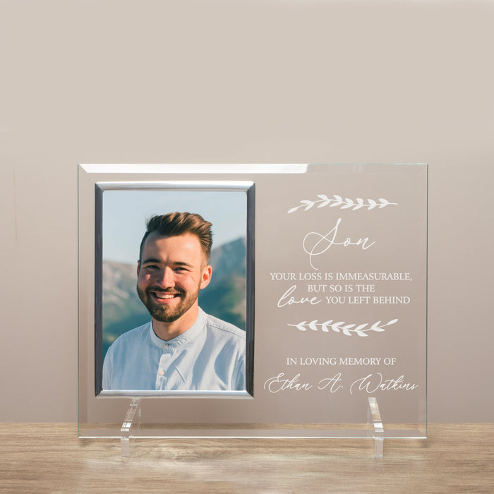 This glass memorial picture frame is engraved with the words, “Son, your loss is immeasurable, but so is the love you left behind,” and personalized with his name.