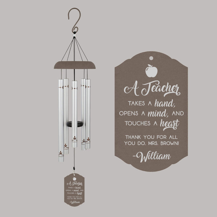 This wind chime features a laser-engraved sail with the heartfelt quote: "A teacher takes a hand, opens a mind, and touches a heart." You can also add your own custom message below the quote.