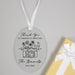 Made of glass, this oval shaped memorial ornament reads "Thank you for capturing our special day," and is personalized with the family's last name and wedding date.